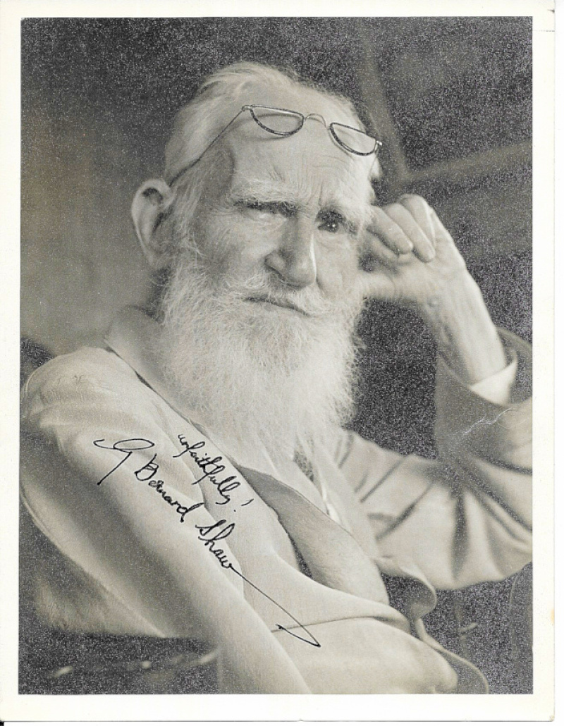 George Bernard Shaw: fine signed photograph, 8.5 x 6.5”; together with a photo of an art portrait of George Moore, signed and inscribed by him in 1931 but poor contrast. (2)