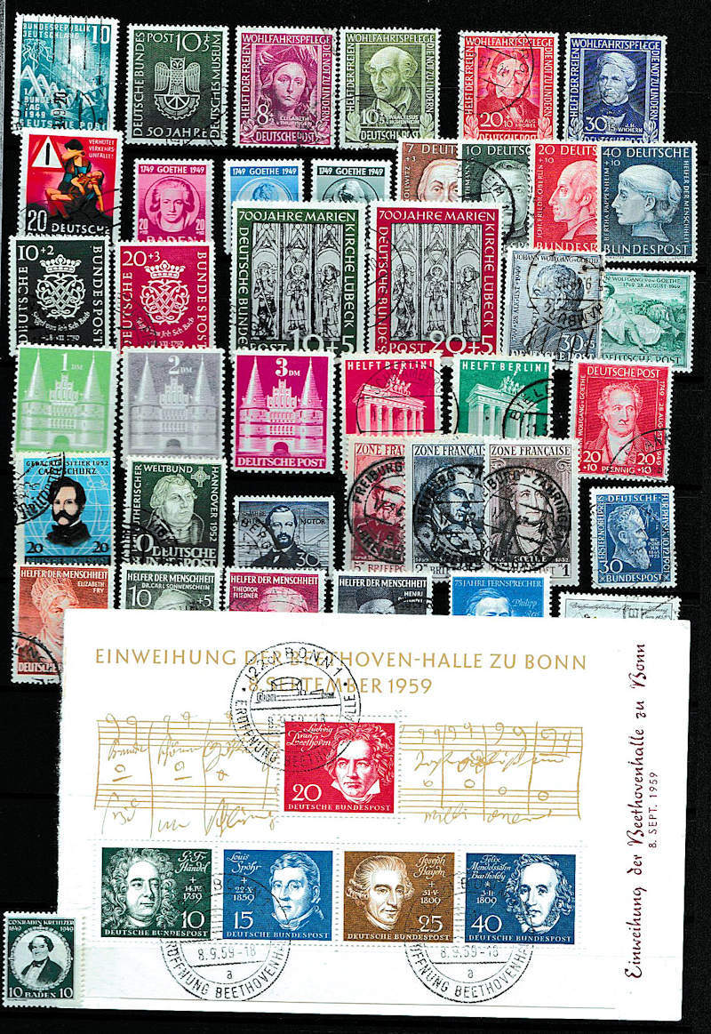 Germany 1945-75 FU and mint ranges in stockbook including many sets of West Germany, post-WW2 Occupation issues (no Russian zone), several Booklets and booklet panes, Beethoven MS FU with special h/s and many other miniature sheets, etc. Most of the mint UM. (Some 100s)
