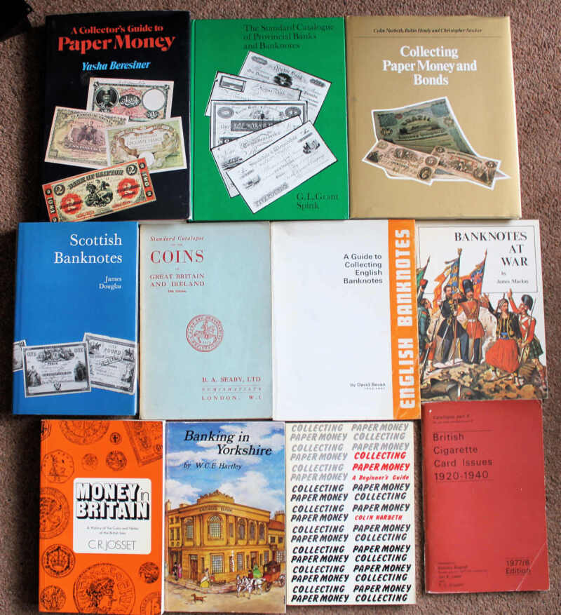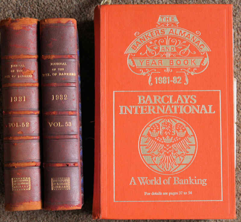 Grant The Standard Catalogue of Provincial Banks and Banknotes 1977; Journal of the Institute of Bankers London 1931-32, two vols, half-leather; The Bankers' Almanac and Year Book 1981-82 (UK & Foreign); and others, mainly banknote related. VG/VF (14)