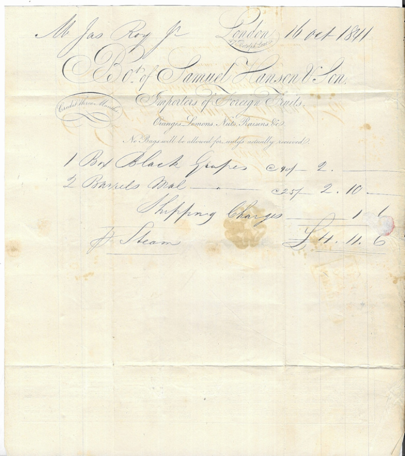 Great Britain 1840 1d Mulready Wrapper, stereo A42, VGU Oct. 1841 from London to Aberdeen with an emphatic Maltese Cross cancel. Internally the wrapper shows the printed letter-head of Samuel Hanson & Son, fruit importers. Light toning.