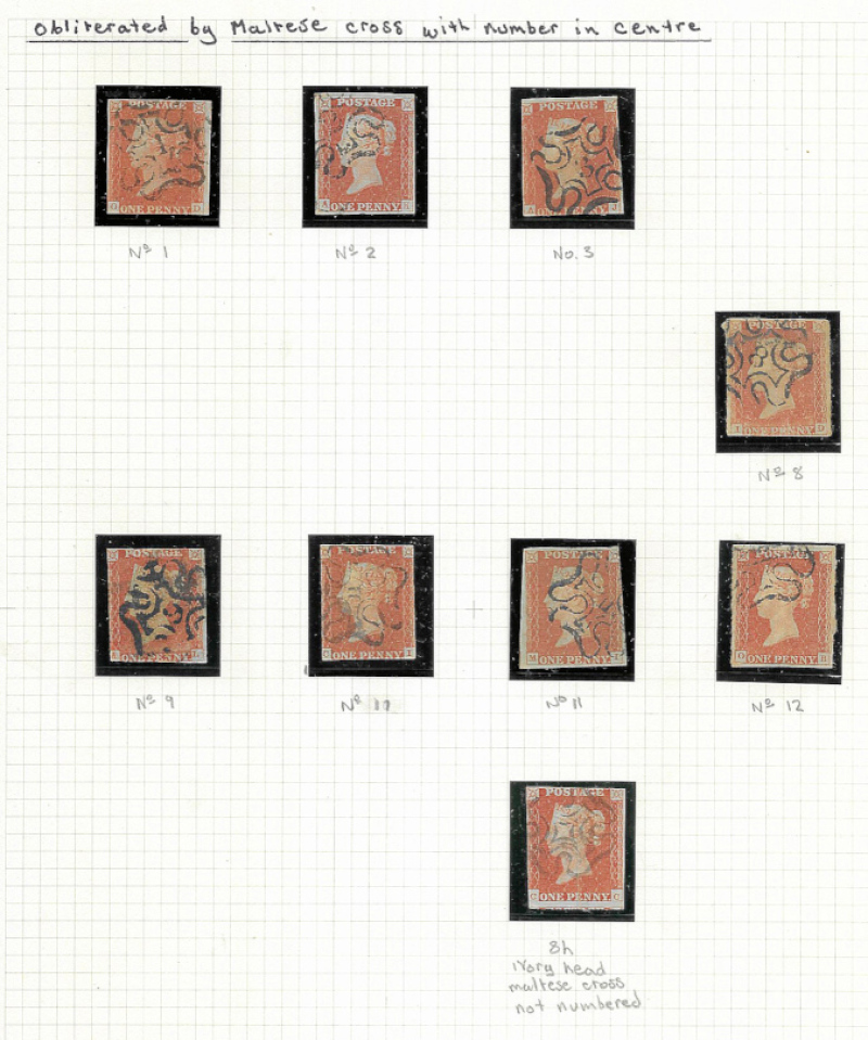 Great Britain 1841 1d (24) and 2d (9), eleven 4-margined. Includes Maltese Cross cancels with Nos. 1, 2, 3, 8, 9, 11 (2) and 12 in cross. (33) Cat £3550.