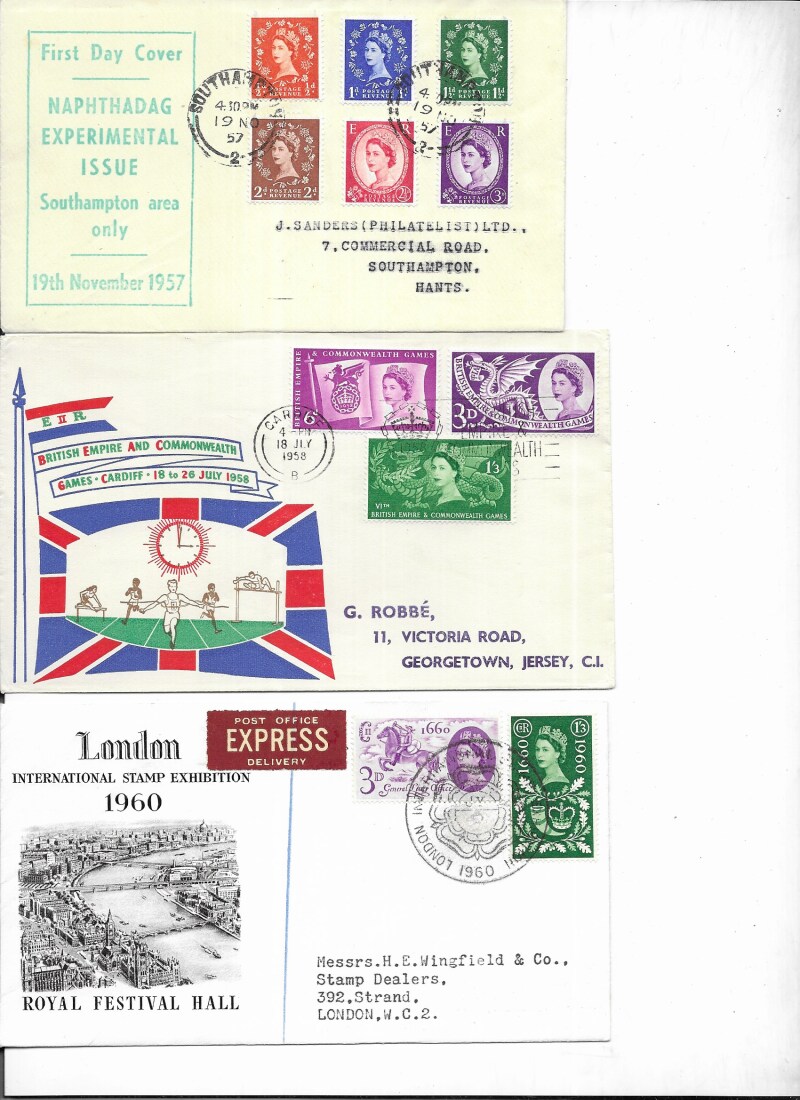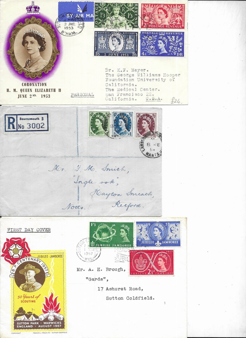Great Britain 1952-1963 First Day and Commemorative Covers, mixed quality but many good items. Illustrated FDCs with typed address include 1953 Coronation (2), 1957 Scouts (3, two unaddressed), 1957 Graphites (display cover), 1958 Empire Games (Cardiff slogan), 1960 GLO (4, two with sp.h/s), 1960 Europa, 1961 POSB (2), 1961 CEPT (3), 1961 Parliamentary Conference (2), 1962 NPY (2, one phosphor), 1963 FFH (2, one phosphor), 1963 Paris (5, two phosphor), and 1963 Nature (2, one phosphor). Also many hand-addressed and/or plain covers including 1954 9d,10d,11d Wildings, and few foreign. (119)