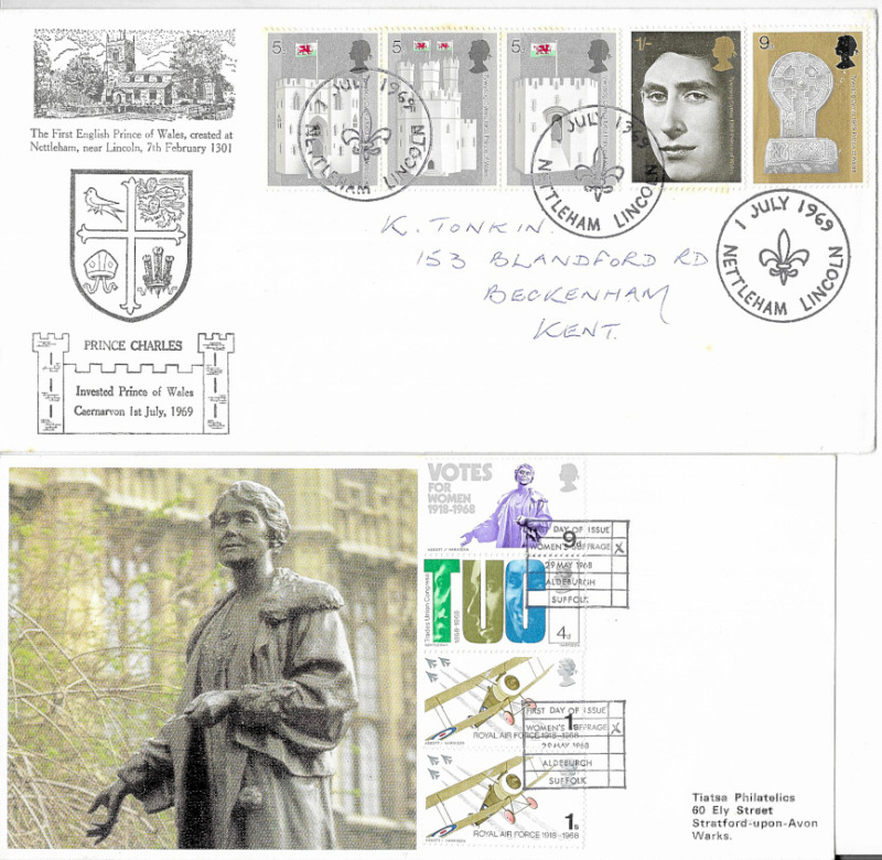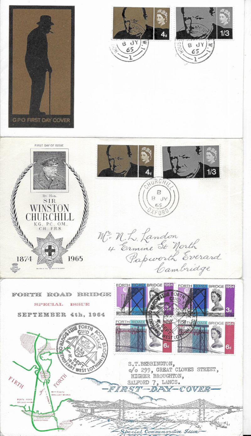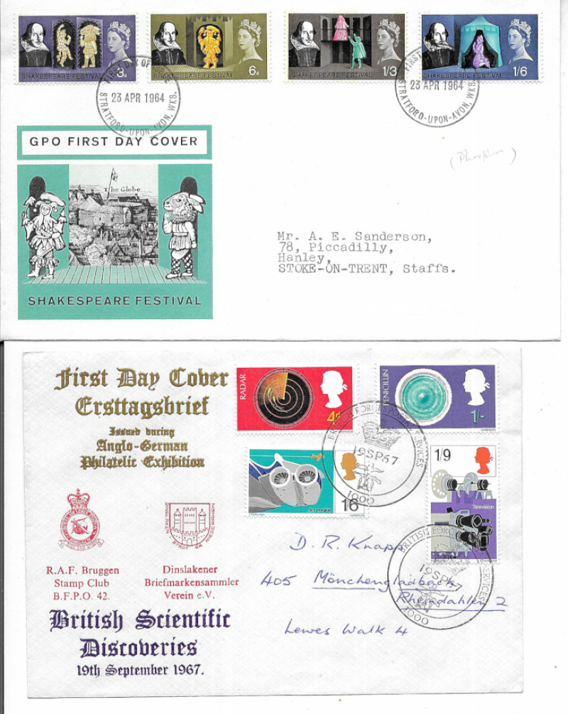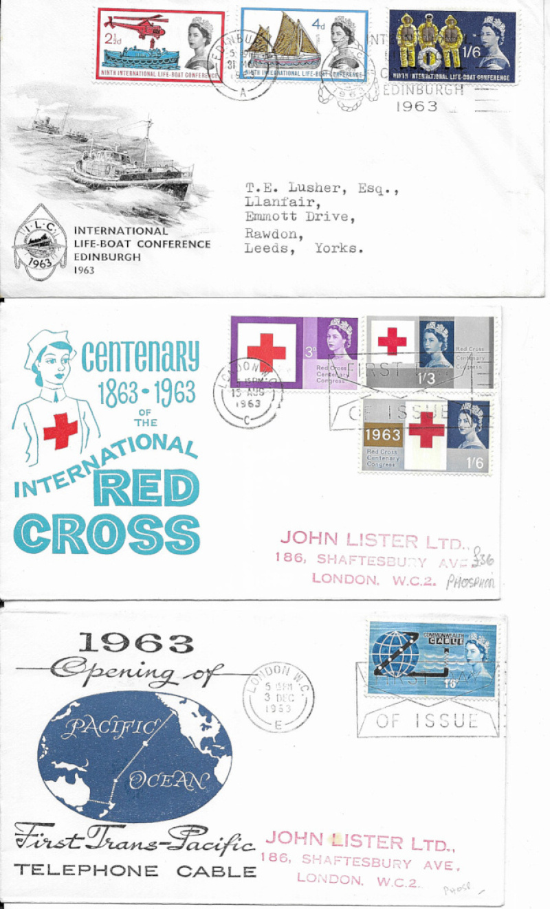 Great Britain 1963-1971 collection of First Day and Commemorative Covers in four albums with some duplication, various postal markings; mostly illustrated with better items noted including 1963 Lifeboat phosphor, 1963 Red Cross phosphor, 1963 Compac phosphor (2), 1964 Shakespeare phosphor, 1964 Forth Bridge plain & phosphor combined, 1965 Churchill with HOUSE OF COMMONS cds and CHURCHILL / OXFORD cds, 1967 Discoveries with BFPO 1000 h/s, 1968 Anniversaries with WOMEN'S SUFFRAGE h/s, and 1969 Investiture NETTLEHAM h/s. Mixed quality. (503)