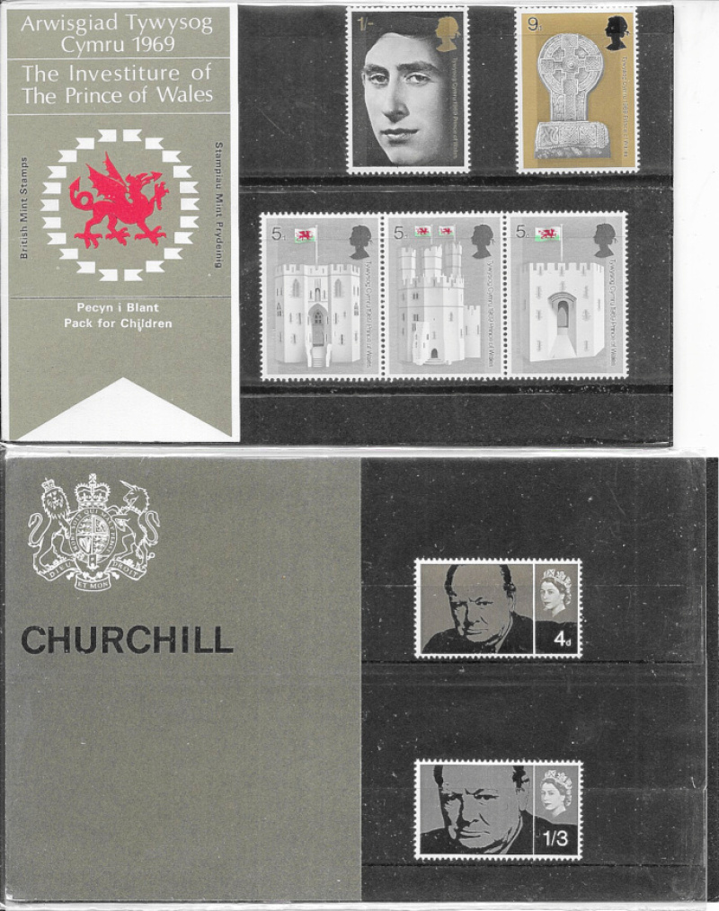 Great Britain 1964-1985 Presentation Pack selection comprising 1964 Churchill, 1966 World Cup, 1967 EFTA, 1969 Investiture (Welsh Pack), 1971 Heinz pack (in orig. FDC), and 1985 BBC Children in Need private pack. Also 2010 Classic Album Covers sheetlet UM