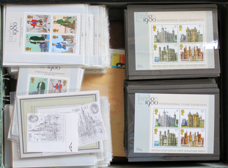 Great Britain 1978 Castles mini-sheets UM (100) and 1979 Rowland Hill mini-sheets (135) UM, all in the issued packs; plus London 1980 50p UM (11), some oddments & an empty stockbook.