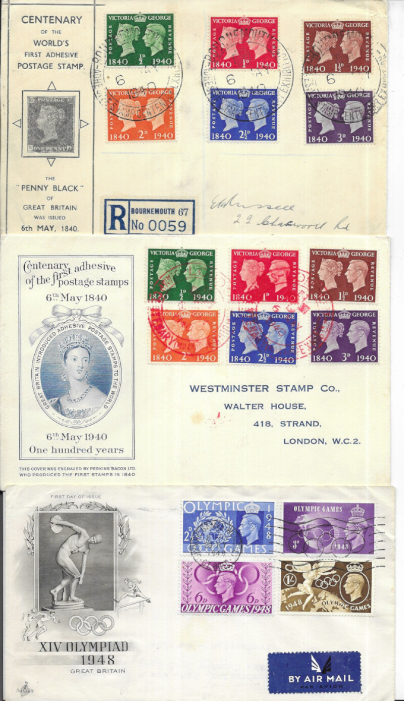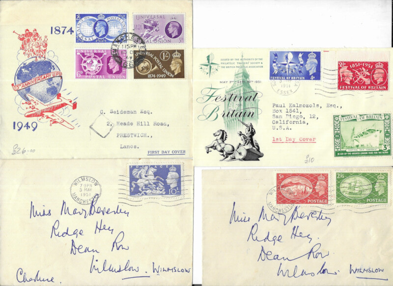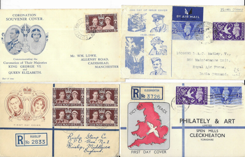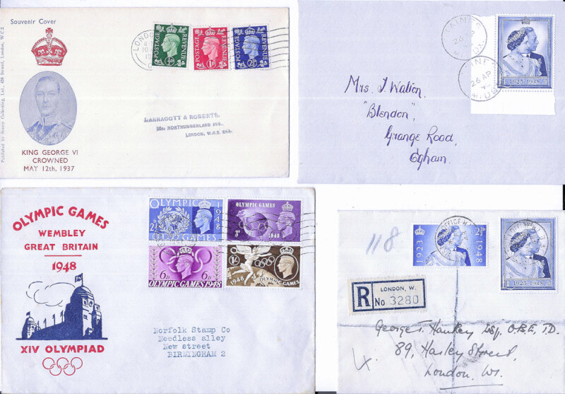 Great Britain George VI covers in album, mostly FDCs including illustrated types for May 1937 Definitives (2), Coronation (3), 1940 Centenary (4), 1945 Victory (3), 1948 Olympics (5), 1949 UPU (7), & 1951 Festival (6); and plain covers for 1937 1½d, 1938 4d & 5d, 1948 RSW £1 (2), 1950 4d blue, and scarce 1951 2s6d, 5s and 10s. Mixed quality. (73)
