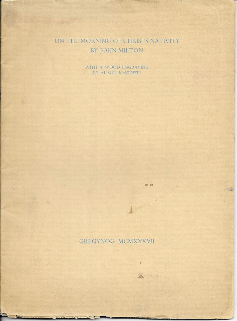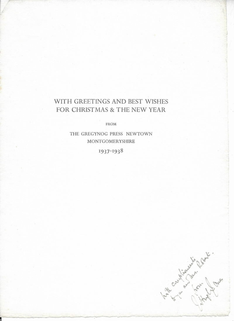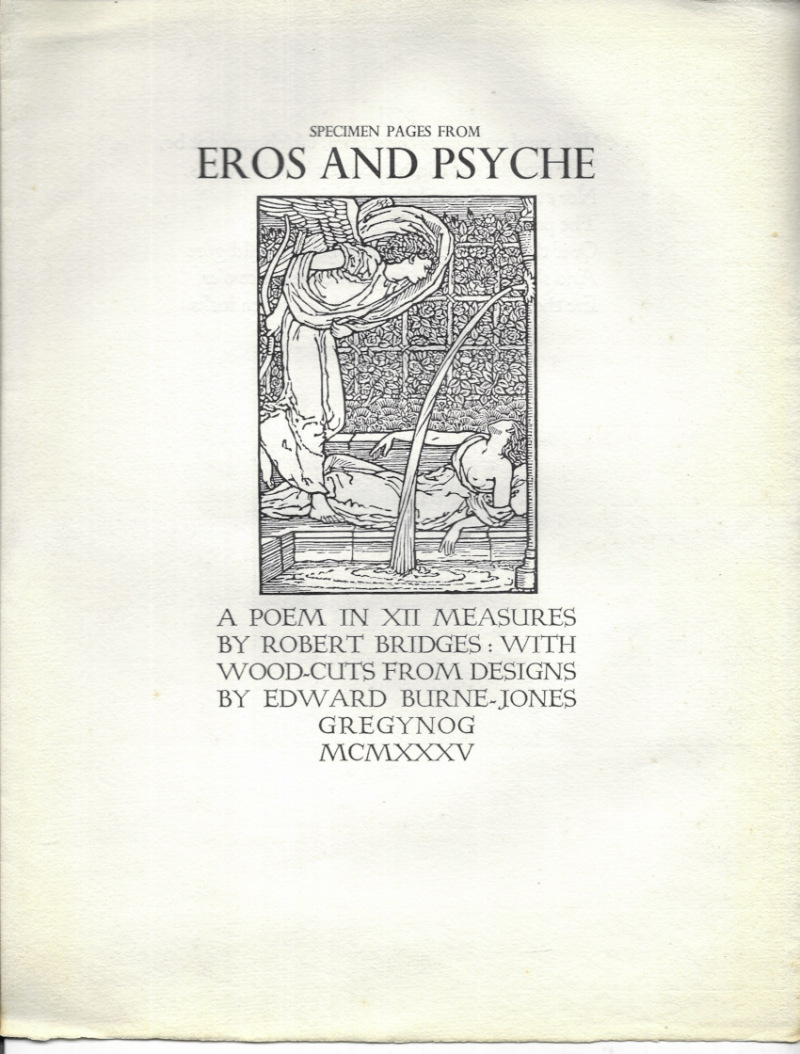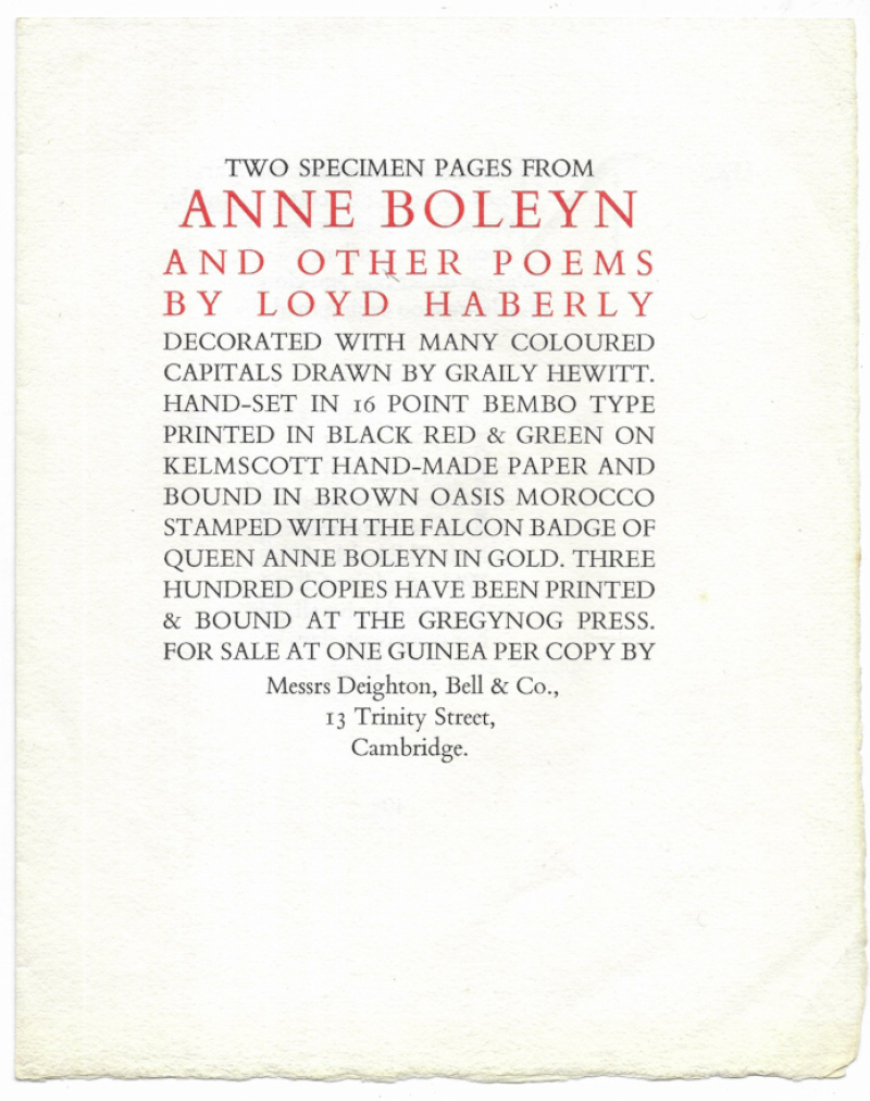 Gregynog Press publications comprising On The Morning of Christ's Nativity 1937, front cover marked, half-title signed by John Hugh Jones; Specimen Pages from Eros and Psyche 1935 (3 examples), Erewhon 1932, and Anne Boleyn 1934 (2 examples); and two publisher's lists.