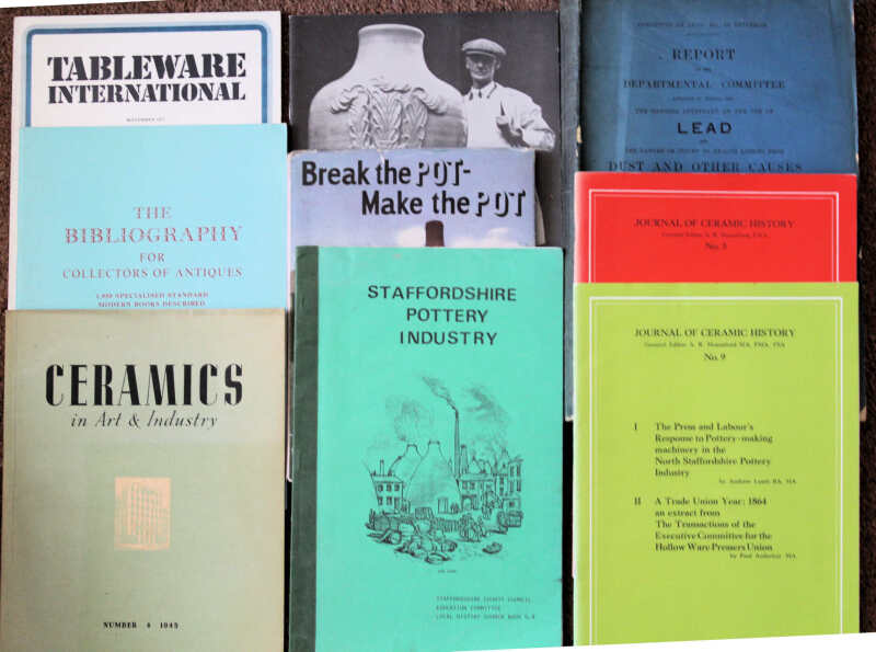 Harold Owen The Staffordshire Potter, Grant Richards, 1901; Tudor-Craig Armorial Porcelain of the Eighteenth Century, 1925, No.454 of 1000 printed; Stoner Chelsea Bow and Derby Porcelain Figures, 1955; and a collection of other works on pottery & porcelain, including four journals. Fair to VF (29)