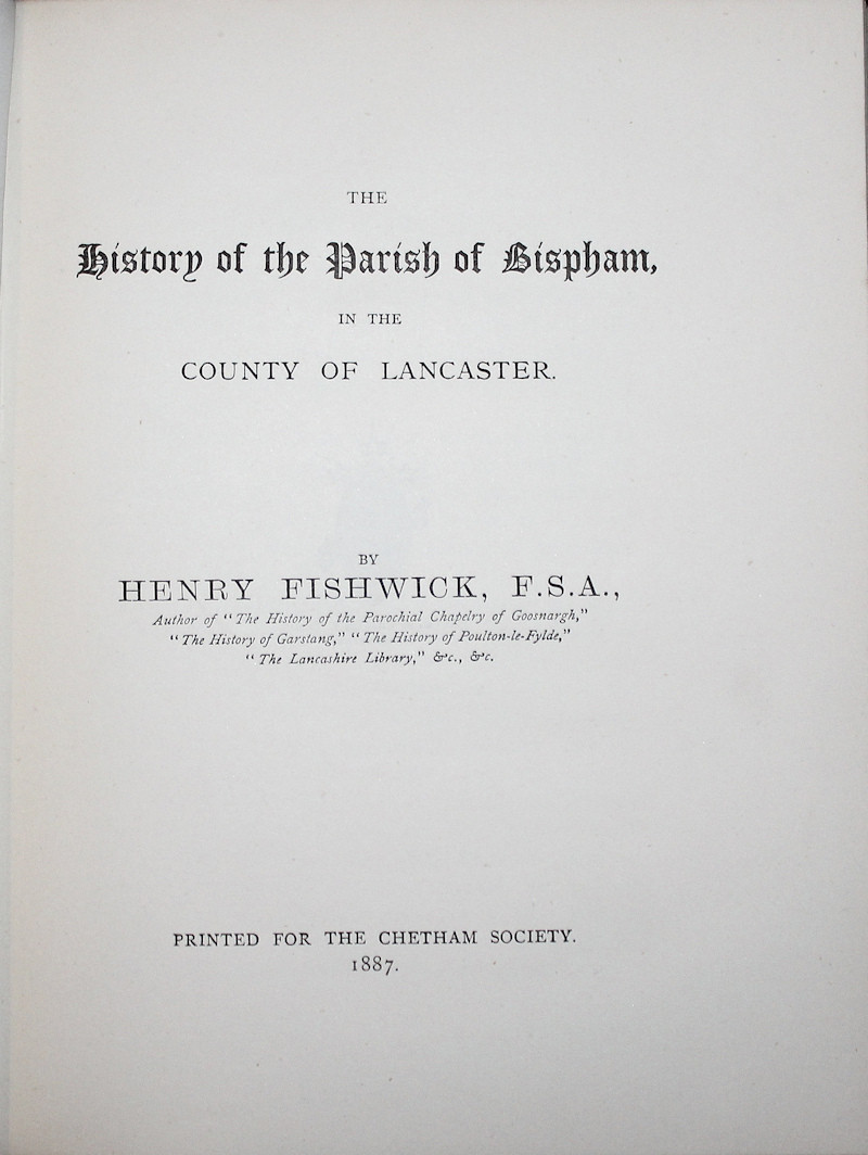 Henry Fishwick "The History of the Parish of Bispham", Chetham Society, 1887, publisher's cloth, gilt, VG;
