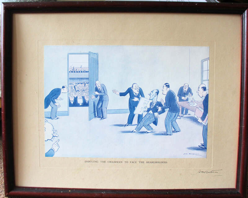 H.M. Bateman Inducing the Chairman to face the Shareholders, colour print, mounted and framed, signed by the artist on the mount. Print size 10 x 14.5”