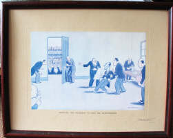 H.M. Bateman "Inducing the Chairman to face the Shareholders", colour print, mounted and framed, signed by the artist on the mount.