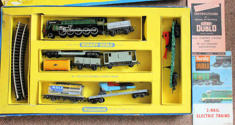 Hornby #2024 ‘00' gauge 2-8-0 Express Goods Train set (incomplete) comprising fine Evening Star locomotive (lacking tender), and rolling stock including Tri-Ang R216 Missile launching wagon & TR 7301 Helicopter pad (helicopter cab missing), plus catalogue, instruction book and some track. In original (very worn) box.