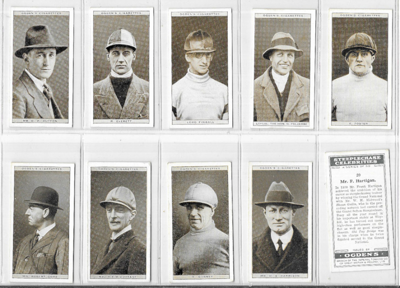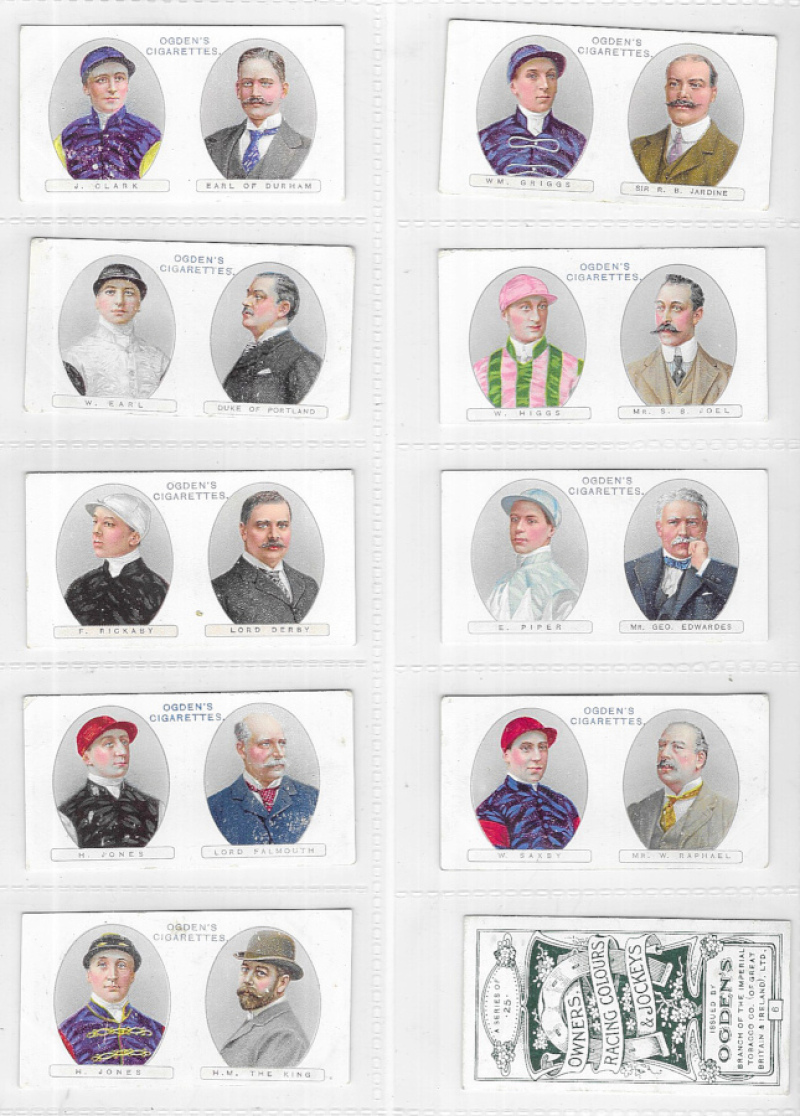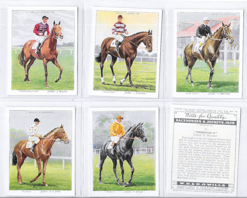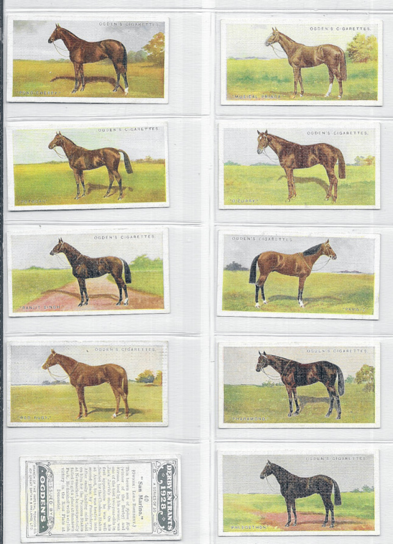 Horse Racing sets in modern album comprising Ogden's Owners Racing Colours & Jockeys 1914, Derby Entrants 1926, Steeplechase Celebrities, Derby Entrants 1928 and Trainers and Owners' Colours 1st & 2nd series; Anstie Racing Series 1922 (both sets, fair to good, most with rounded corners); and Wills Racehorses & Jockeys 1938. Generally good to VF.