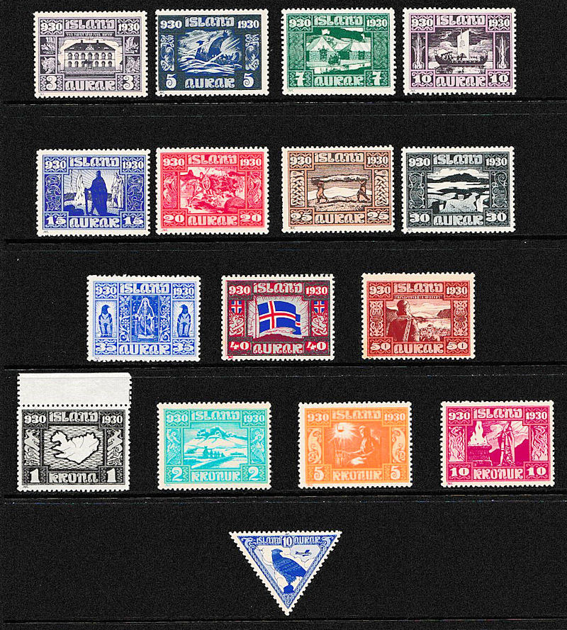 Iceland 1930 Millenary set fine Mint, some UM including 1kr. The 20aur with some pulled perfs o/w VF. Cat £350. SG. 156/173