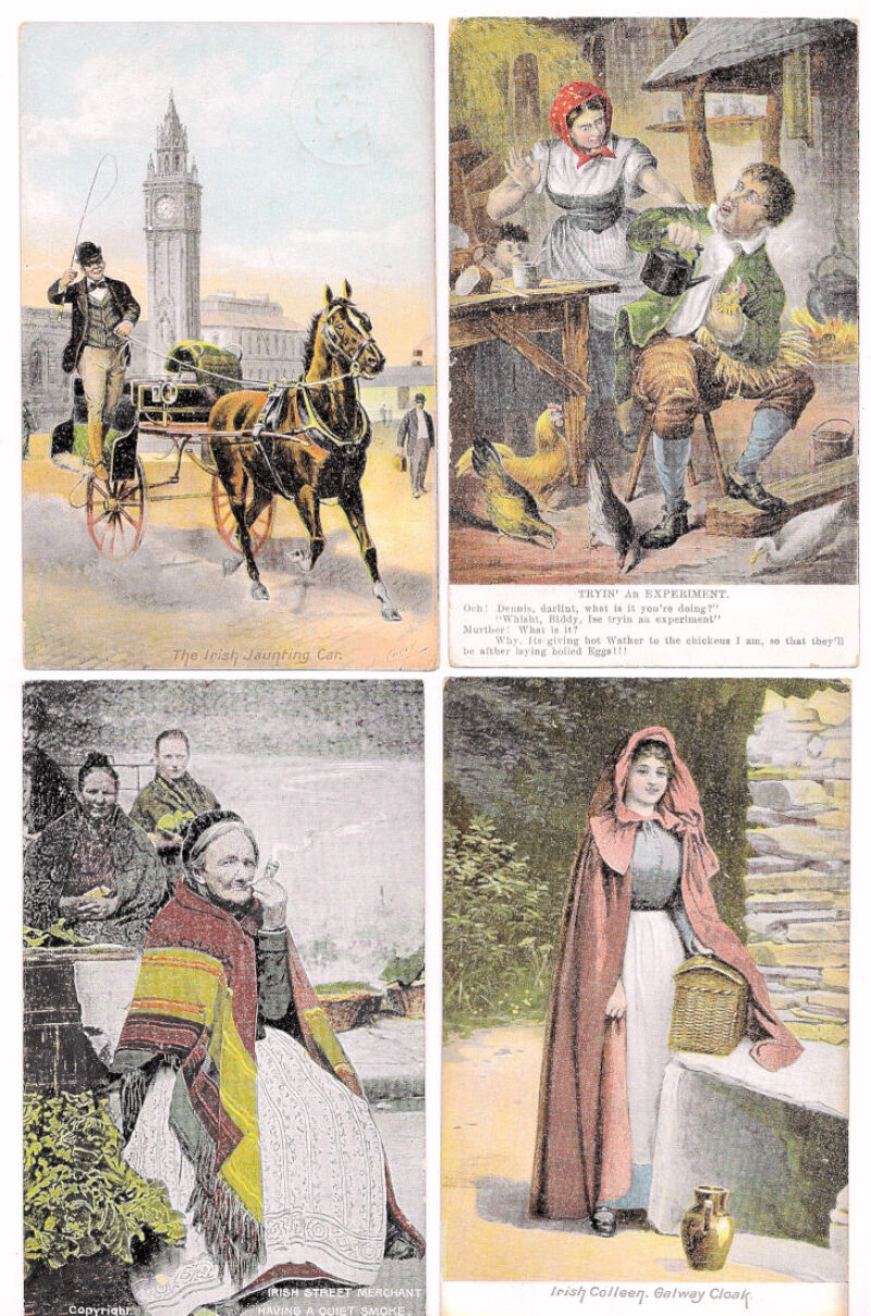 Irish themes 1900s to 1930s, mostly coloured including John Carey and other named artists; with humorous types, glamour, rural scenes,