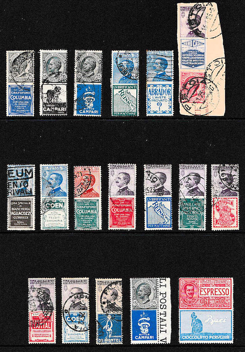 Italy 1924-25 Definitives se-tenant with advertising labels, a mainly used collection on stockleaf including SG 171f and 171m. The 60c Espresso UM. Cat approx. £2200. Fair to fine.