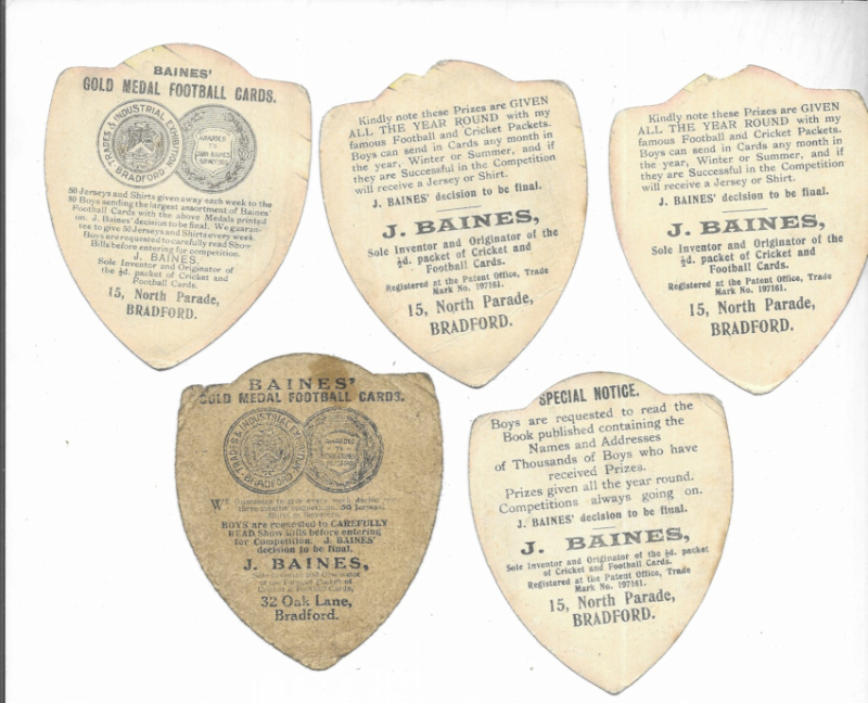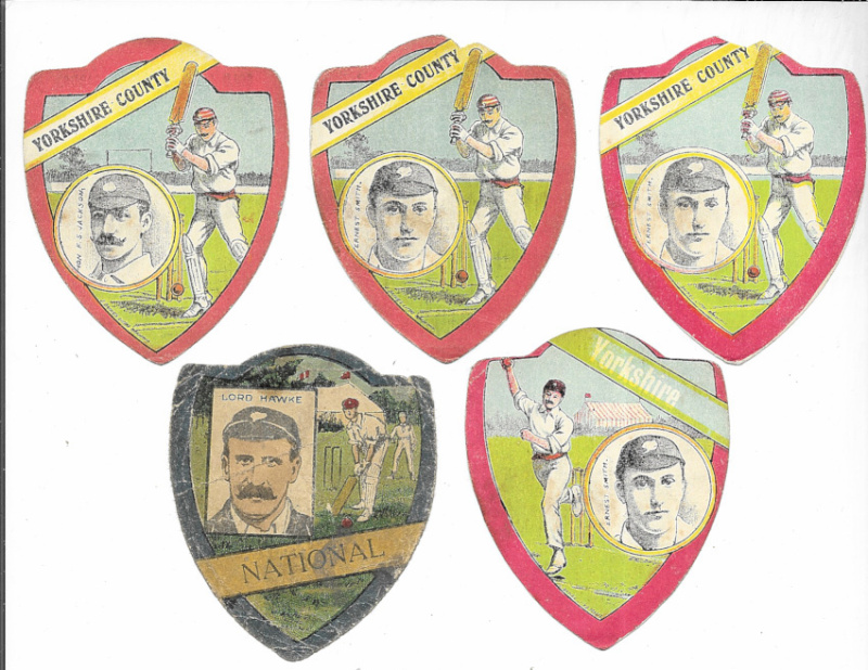 J. Baines – Cricket: Yorkshire County, four shield shaped cards with insets of Ernest Smith (3) and F.S. Jackson, two chipped at top; together with National with inset of Lord Hawke (stained and creased), c.1900. (5)