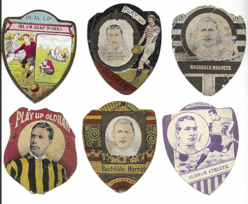 J. Baines – Football and Rugby. An Oldham and Rochdale selection including Oldham Athletic, all with insets of players, together with Irlam Soap Works. Mixed condition. (6)