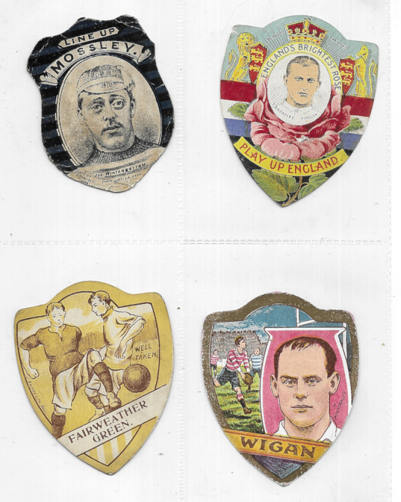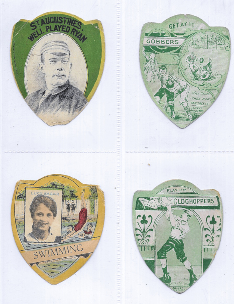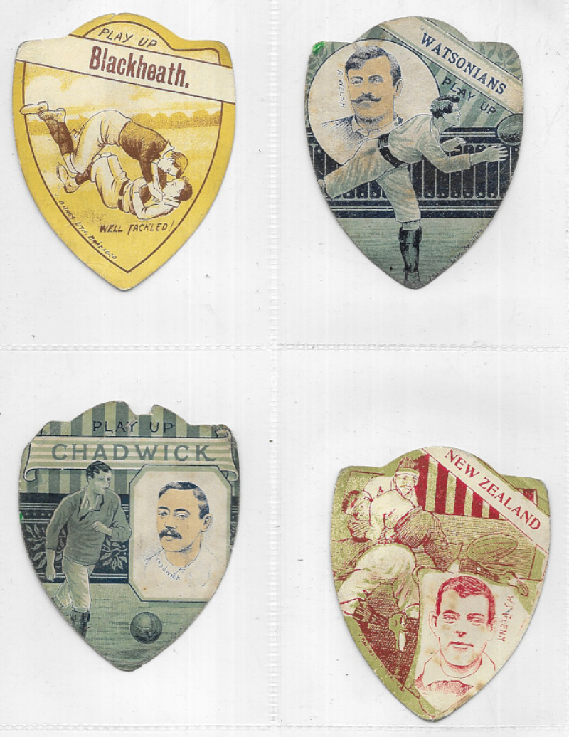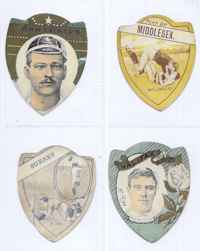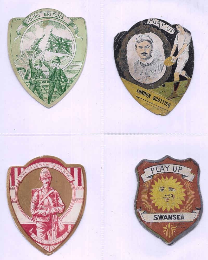 J. Baines – Sport. A collection of the shaped cards in modern album, with main interest in Rugby, plus some soccer & few other sports and a small number of Boer War period patriotic. Countrywide with some emphasis on Lancashire clubs, Scotland, and some County teams, together with a few New Zealand. Mixed condition. (129)