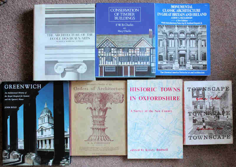John Bold Greenwich: An Architectural History of the Royal Hospital for Seamen 2000, in d/jkt; Cullen Townscape 1965, in d/jkt; Charles Conservation of Timber Buildings 1984, in d/jkt; Rodwell Historic Towns in Oxfordshire 1975; Dean Architecture of the 1930s, 1983; Cordingley Normand's Parallel of the Orders of Architecture 1951; Drexler The Architecture of the Ecole des Beaux-Arts 1984, in d/jkt; and related works. Good to VF. (33)