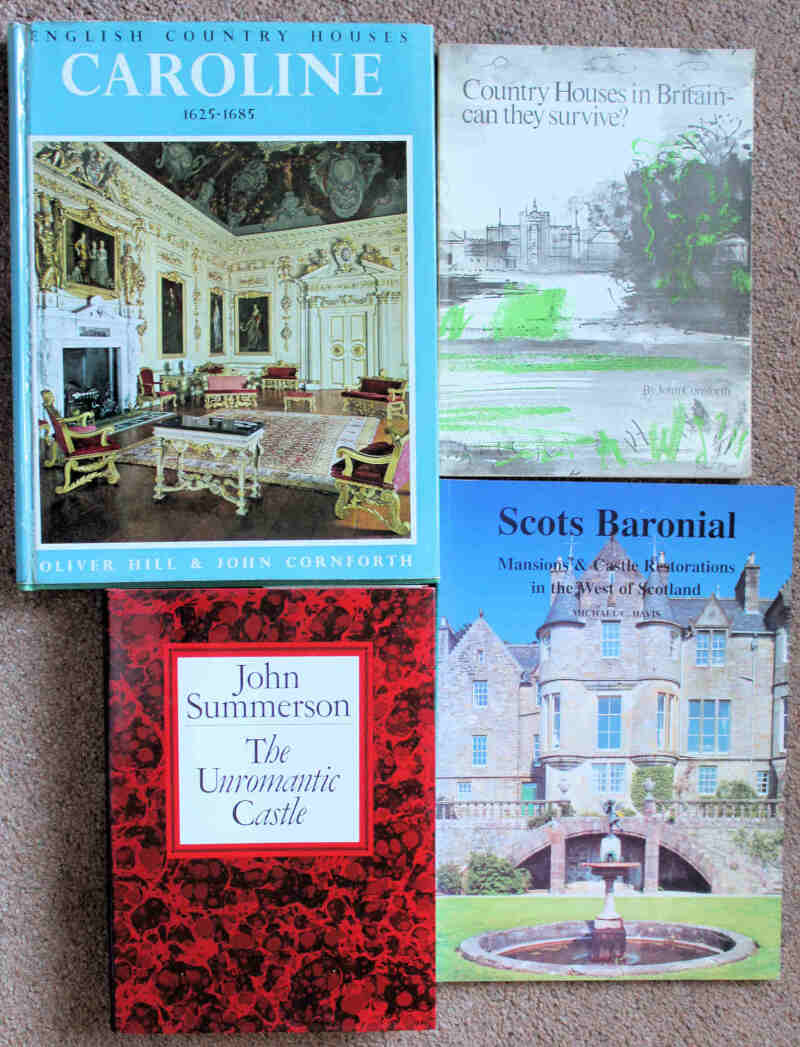 John Cornforth Country Houses in Britain – can they survive? 1974, cover artwork by John Piper; Davis Scots Baronial – Mansions & Castle Restorations 1996; Hill & Cornforth English Country Houses, Caroline 1625-1685, 1966, in d/jkt; and related works. (9)
