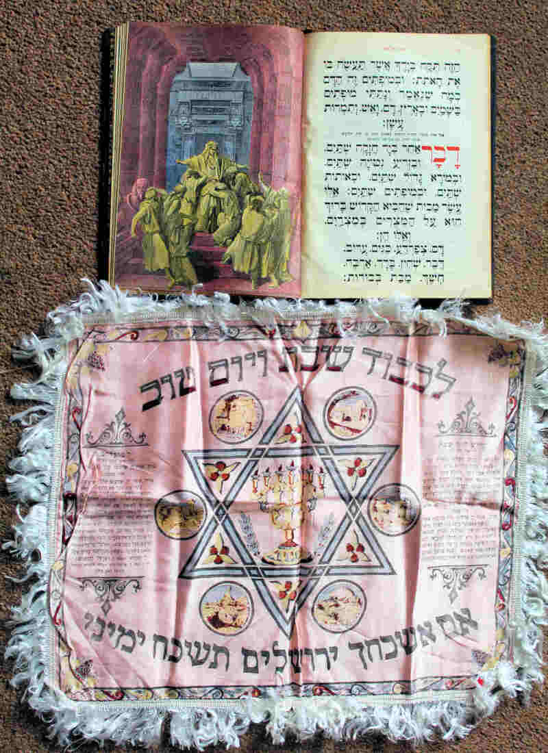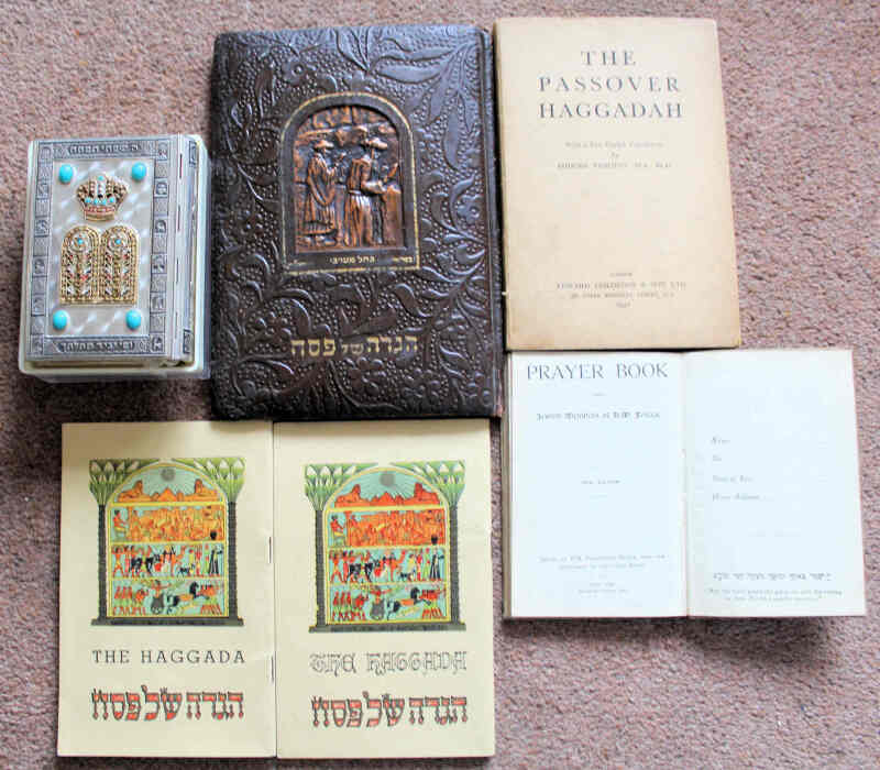 Judaica interest with four illustrated editions of The Haggadah, one bound in gilt cloth with metallic inlay and Gustave Dore wood engravings; a bilingual copy of Siddur Avodat Israel in elaborate metallic binding; 1940 Prayer Book for Jewish Members of H.M. Forces issued by HMSO; and a ceremonial pictorial satin cloth. Good to fine.