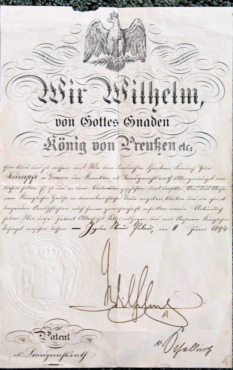 Kaiser Wilhelm II of Prussia: ink-signed Civil Appointment Document of 1894, co-signed by a senior civil servant lower right. Couple of splits along the folds, slight loss at top edge. Overall 32 x 21cm