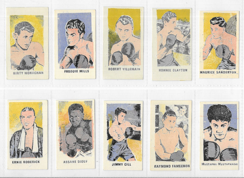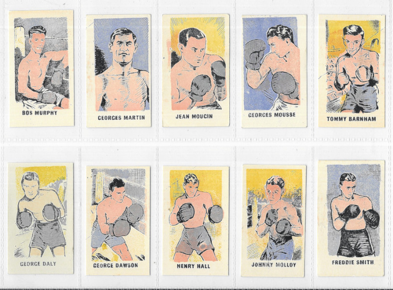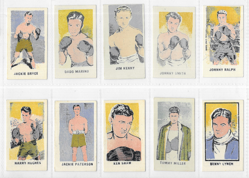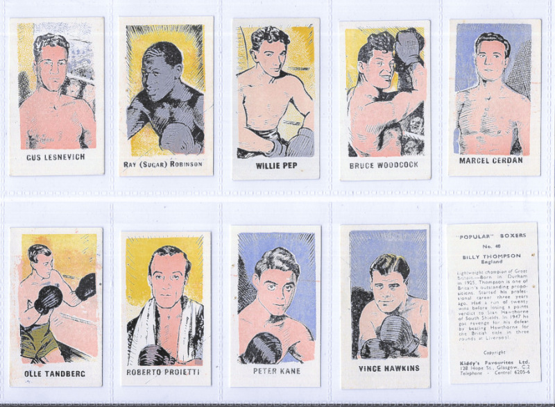 Kiddy's Favourites Popular Boxers 1950, set of 50, most with black captions, #18 in blue, most with staple marks (as issued). #32 (Sugar Ray Robinson) creased. #18 with colour offset on back, #14 with distributors handstamp on back.