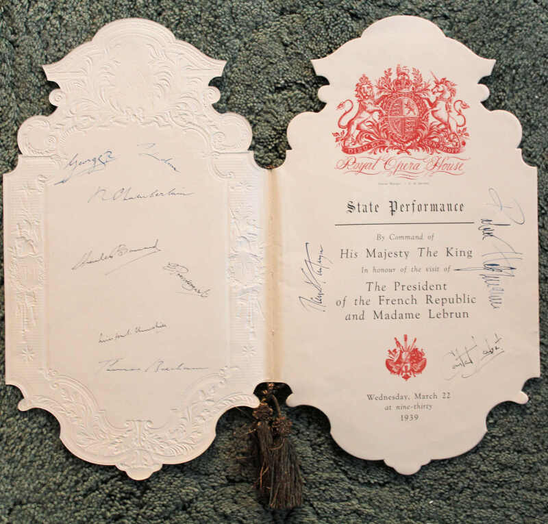 King George VI, Winston Churchill and others: an autographed 1939 Covent Garden Opera programme signed by George VI, Winston S. Churchill, Neville Chamberlain, President Lebrun, Thomas Beecham, Robert Helpmann, Margot Fonteyn, Constant Lambert and two others, for a concert arranged in honour of the State visit of the French president, 22nd of March 1939. 15.5 x 9”. Fine.