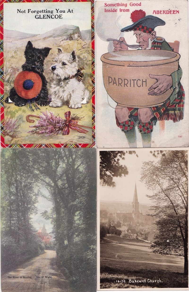 Largely UK topography in old album, plus few Germany, comic etc; country-wide with some interest in Scotland, English village scenes, York, etc. (408)
