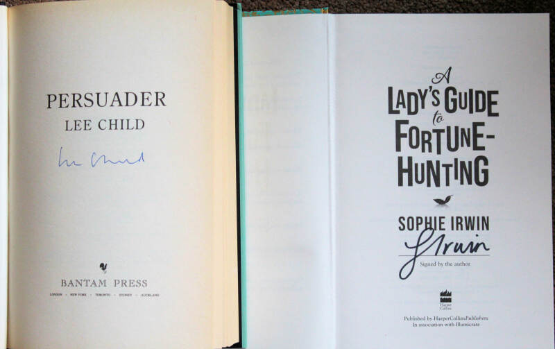 Lee Child Persuader 2003, first edition in d/jkt, signed by the author on title page; Sophie Irwin A Lady's Guide to Fortune-Hunting 2022, special signed first edition in decorated boards; and other author-signed modern fiction including Peter James, Salman Rushdie, Michael Connelly, and Ian Rankin. Works by Alan Hollinghurst and Karin Slaughter with tears to d/jkts o/w fine. (11)