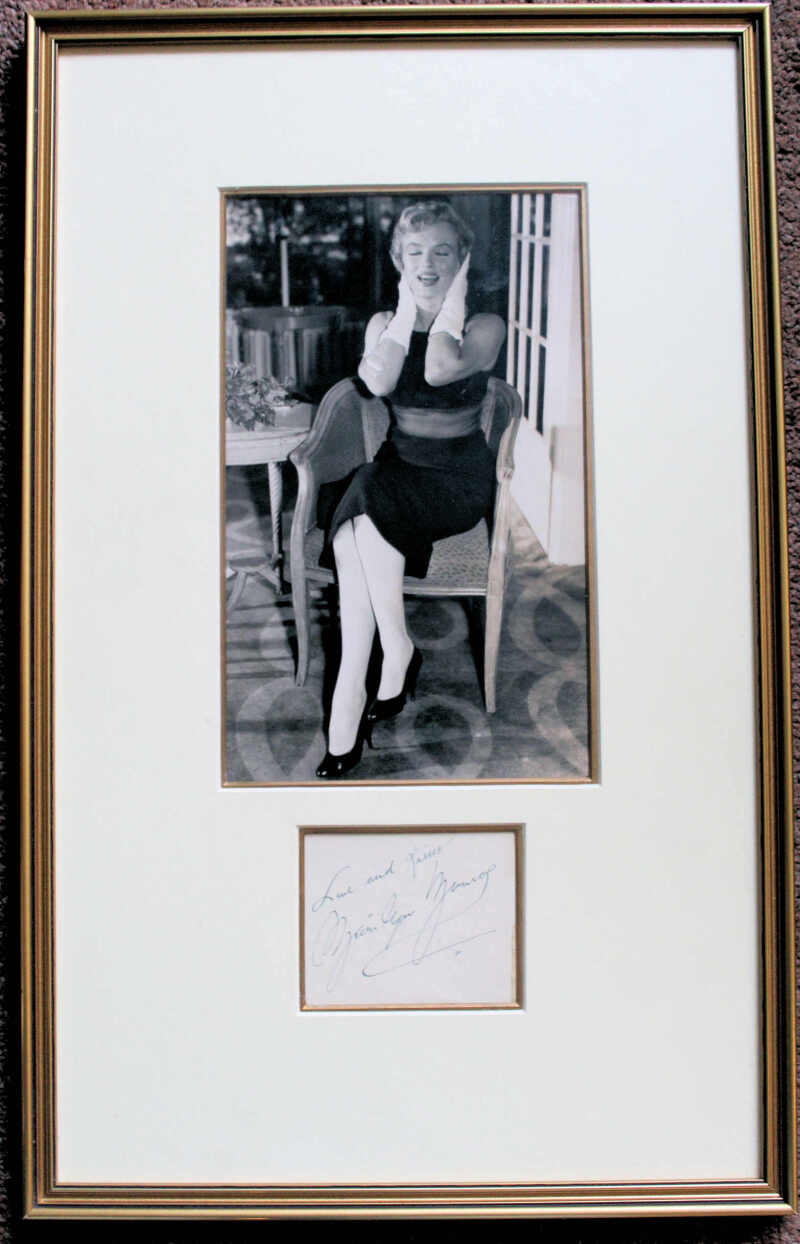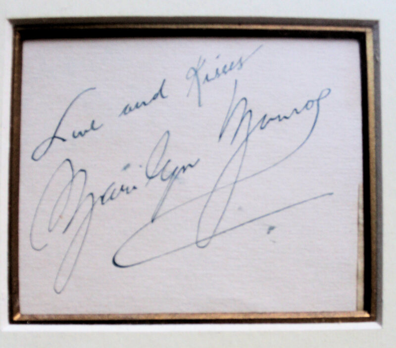 Marilyn Monroe: a signed page inscribed Love and Kisses Marilyn Monroe, and matted with a Planet Press photo taken 13th June 1956 at the Savoy Hotel, London, prior to the filming of ‘The Prince and the Showgirl' with Laurence Olivier, the autograph obtained at the Savoy. Framed and glazed. Overall 49 x 30cm. Photograph with light creasing.