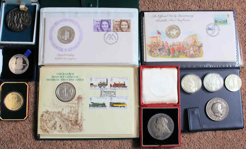 Medallions (25) 19th Century to 1980s including large 1897 QV Jubilee in bronze; 1976 Montgomery silver proof; Olympic Games (3, in .925 silver); Salzburg Music Festival; 1915 Lusitania medal; and five medallic first day covers, four in sterling silver. Also few coins including USA 1936 Half-Dollar and two Eisenhower dollars; and various oddments.