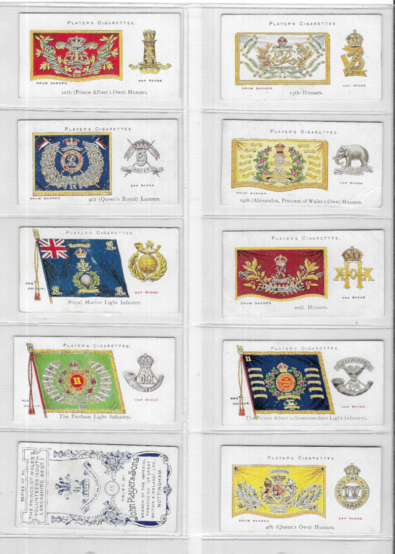 Military interest: seven sets in modern album including Wills (Scissors) Heroic Deeds 1913; Player Regimental Colours and Cap Badges (Regulars) Colonial & Indian Army Badges, War Decorations & Medals and Army Life, and Louis Gerard Modern Armaments. A few cards slightly marked, some backs of War Decorations with light colour offset o/w VG.