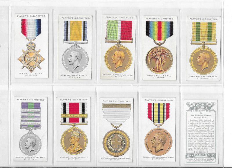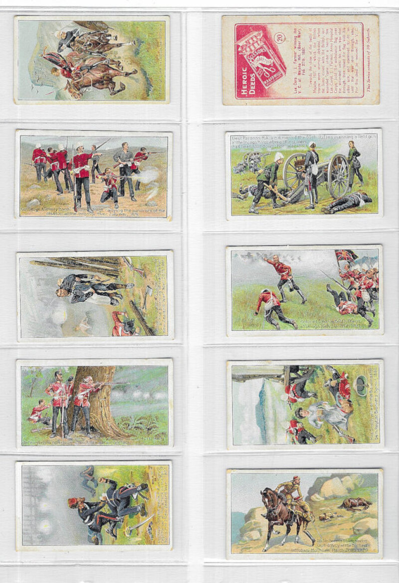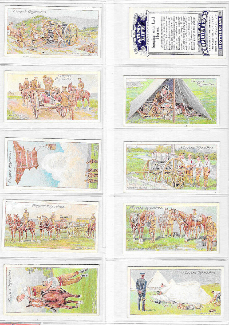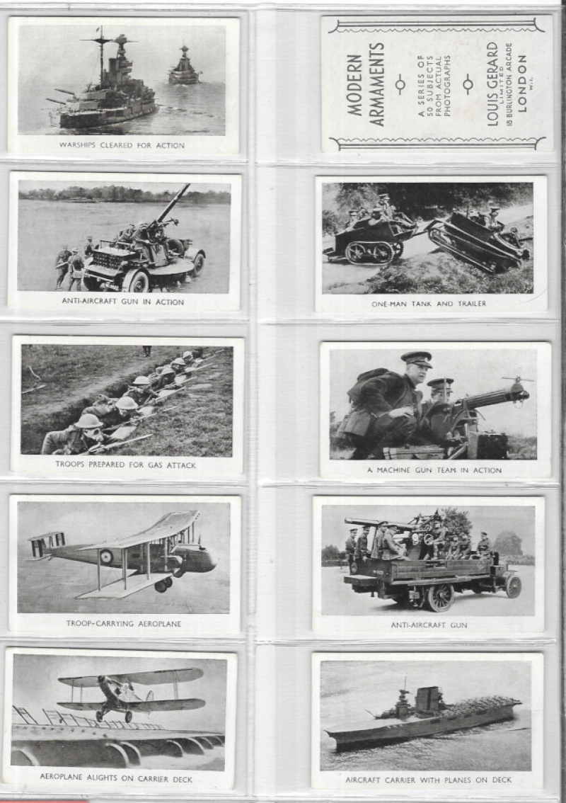 Military interest: seven sets in modern album including Wills (Scissors) Heroic Deeds 1913; Player Regimental Colours and Cap Badges (Regulars) Colonial & Indian Army Badges, War Decorations & Medals and Army Life, and Louis Gerard Modern Armaments. A few cards slightly marked, some backs of War Decorations with light colour offset o/w VG.