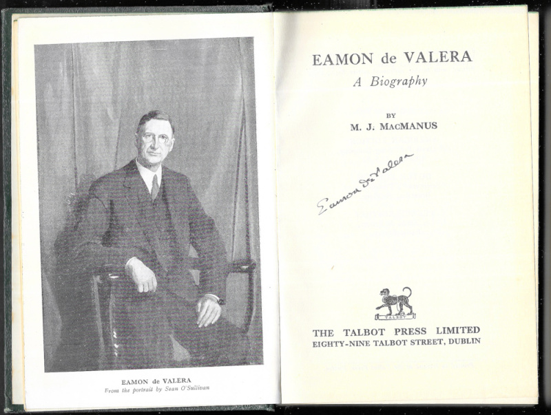 M.J. MacManus Eamon de Valera: A Biography, Talbot Press, Dublin, 1947, signed by Eamon de Valera on title page. Presentation copy to ‘Tim McMahon' with gift inscription of the Lord Mayor & Lady Mayoress of Dublin, dated 1952 on front endpaper. Gilt cloth, b/w plates, VG.