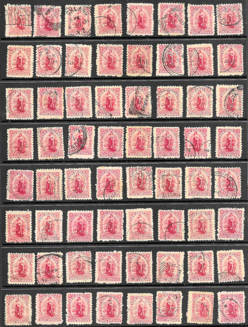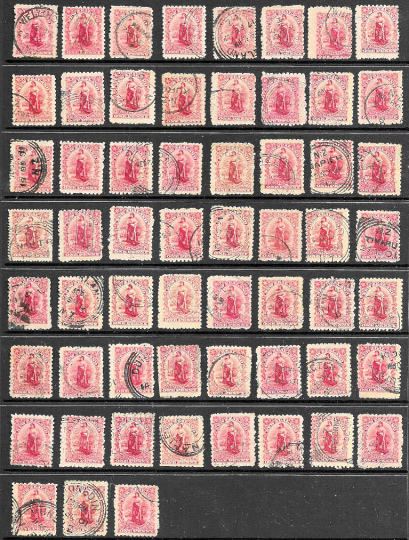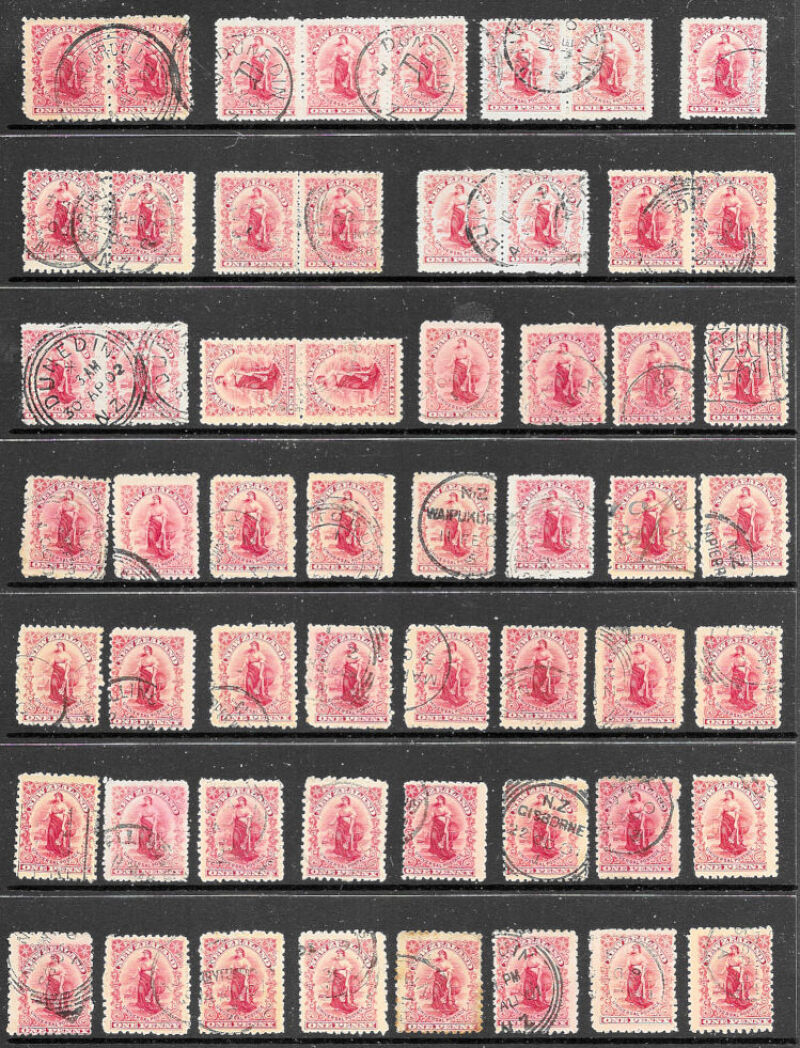 New Zealand early-1900s Penny Universals, a good accumulation on three pages, unchecked for papers and perfs. (179)