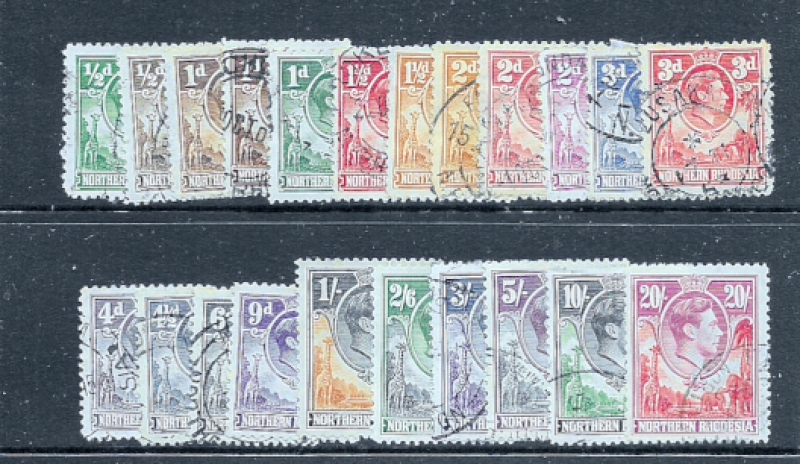 Northern Rhodesia 1938 set to 20s FU, the 3s value with couple of short perfs. Includes 1d chocolate shade. Cat £170 (22)