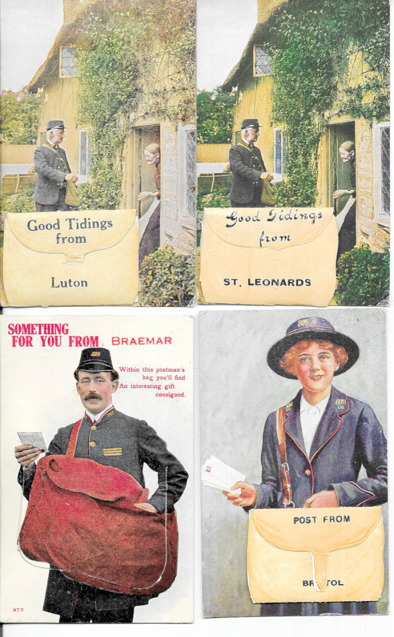 Novelty pull-outs featuring Postmen, with duplication of types, but with pull-out views of many different UK towns. Fair to fine. In two modern albums. (140).
