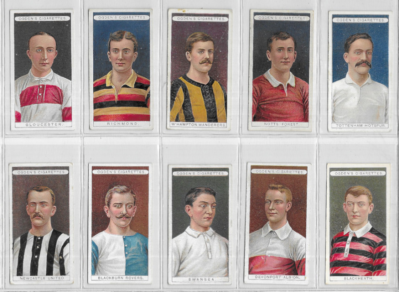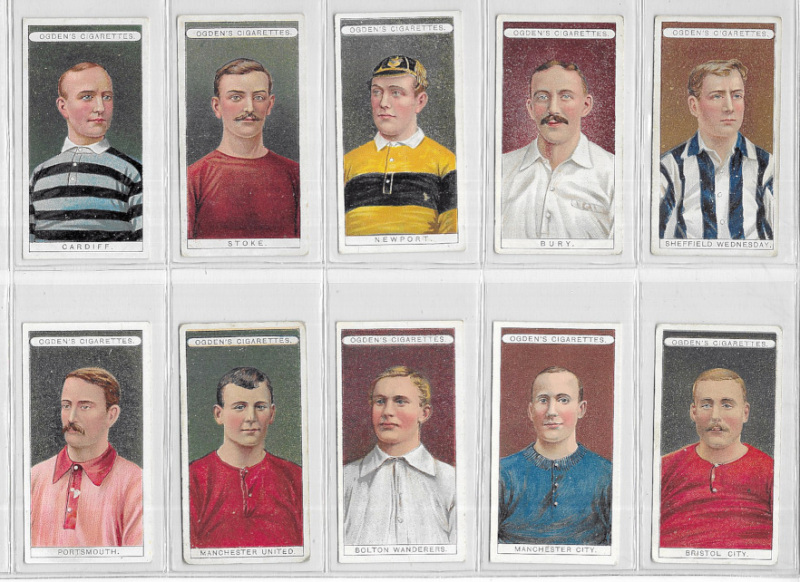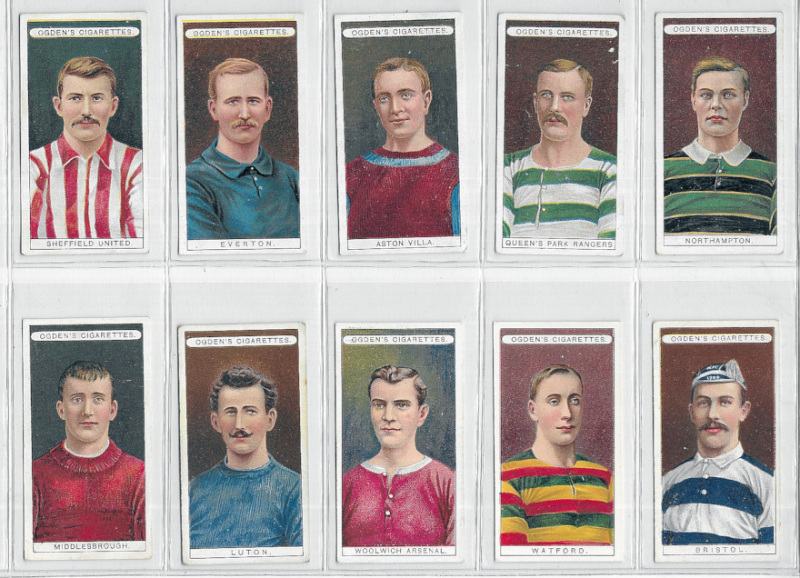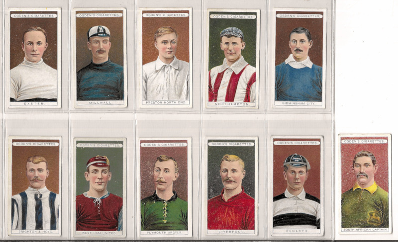 Ogden's Football Club Colours 1906, the set of 51, mostly good to fine, card #4 (Southampton) with small corner crease, card #23 (Wolves) marked in upper border. Some including #37 (Manchester United) show wear to corners. (51)