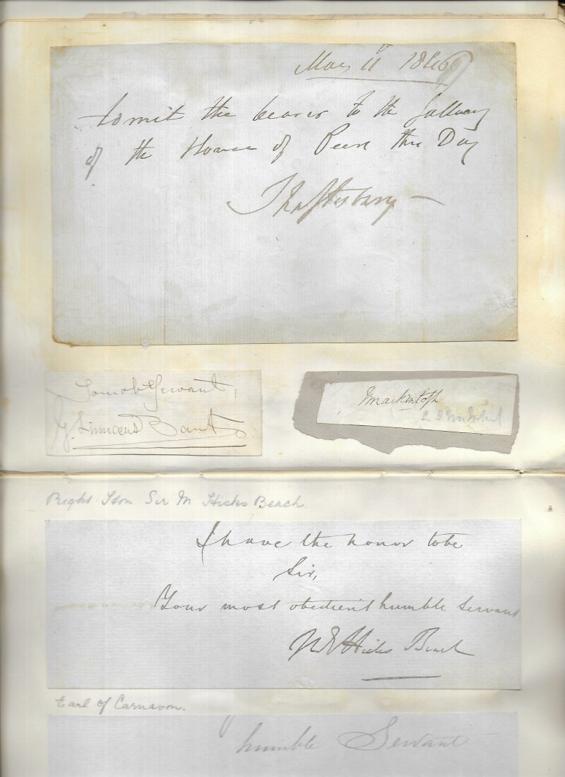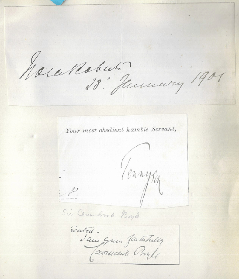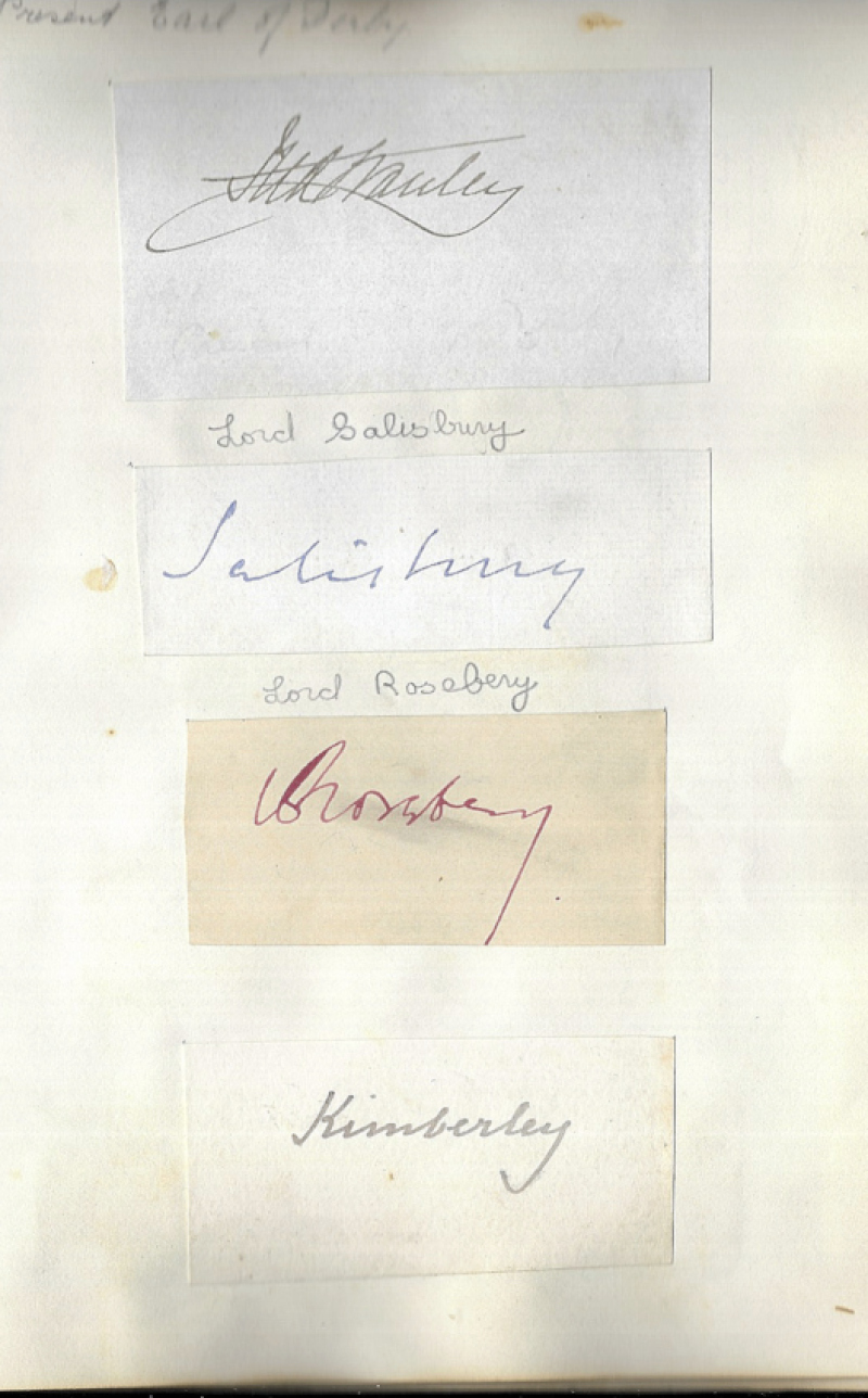 Old Album of 19th Century Autographs, mostly cut signatures laid down, plus 29 complete letters; Peers & Celebrities including Hall Caine (ALS), Robert Peel, 15th Earl of Derby, Joseph Hulme (ALS), Lord Salisbury, Lord Rosebery, Earl Grey (1898 ALS), Joseph Chamberlian (2), Earl Shaftesbury (1846 note), G. Linnaeus Banks, Edward Stanhope, Annie Swan, Marie Corelli, Joseph Hocking (ALS), Alfred Lord Tennyson, Seymour Hicks, and various others. Some pages removed. (149)