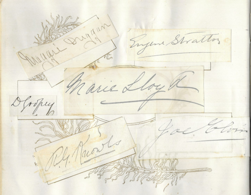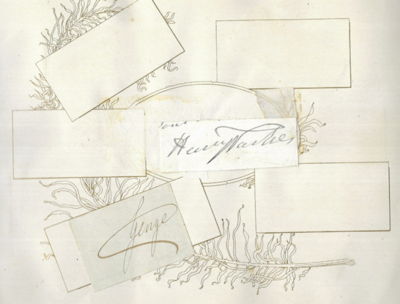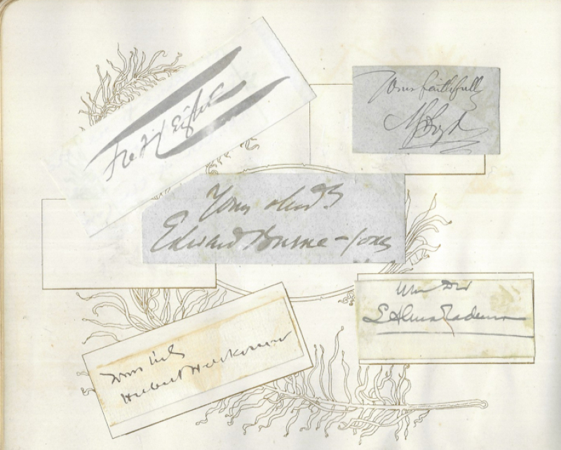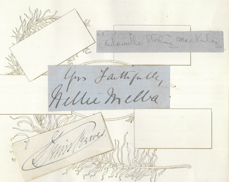 Old album of cut signatures, including autographs of Nellie Melba, George (later George V), W. Harrison Ainsworth, J.K. Jerome, Michael Davitt, Marie Lloyd, W. Gladstone, Edward Burne-Jones, J. R. Capablanca (chess champion), Gilbert Dalziel, George Cutzon, Lord Roberts, Sir Evelyn Wood, Solomon Solomon, and many others. (109)