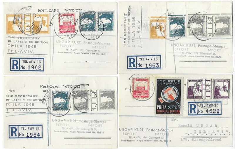 Palestine 1945 Philatelic Exhibition, group of 7 PCs with special postmarks and various frankings, one with exhibition label. VG/F (7)