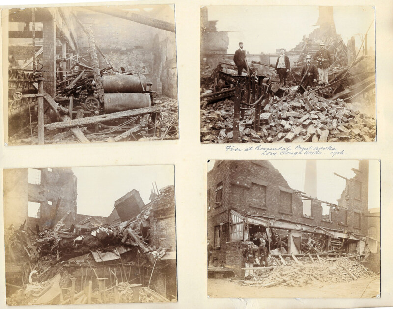 Photographs of the Fire Disaster at Rosendal Print Works, Love Clough, Rossendale,1906, laid down on two album leaves, each 9.5 x 12cm,