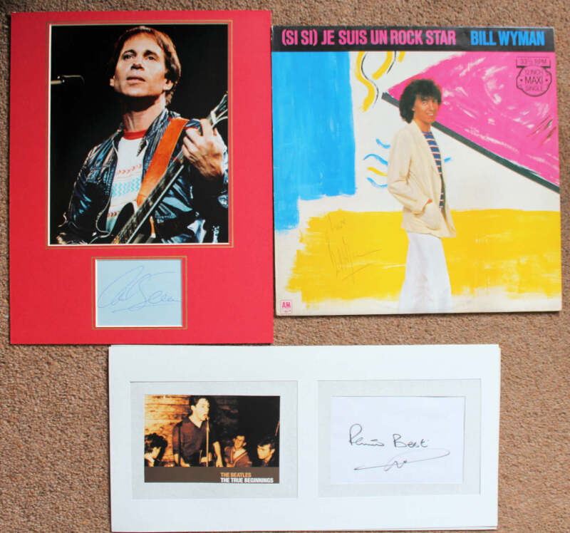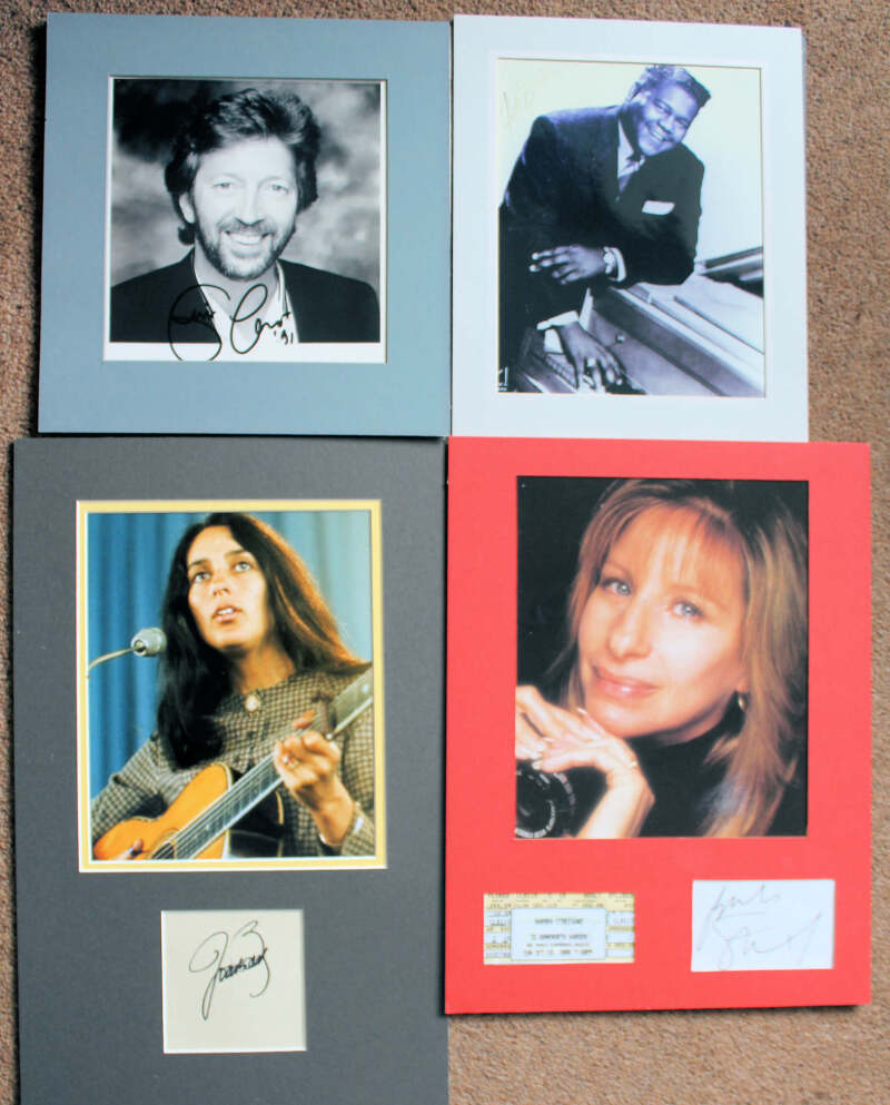 Popular Music autographs comprising Paul Simon (with C. of A.), Bill Wyman (signed LP sleeve, with record), Fats Domino (signed photo), Joan Baez, Eric Clapton (signed photo), Barbra Streisand, Pete Best, and Jack Johnson (signed CD sleeve). (8)
