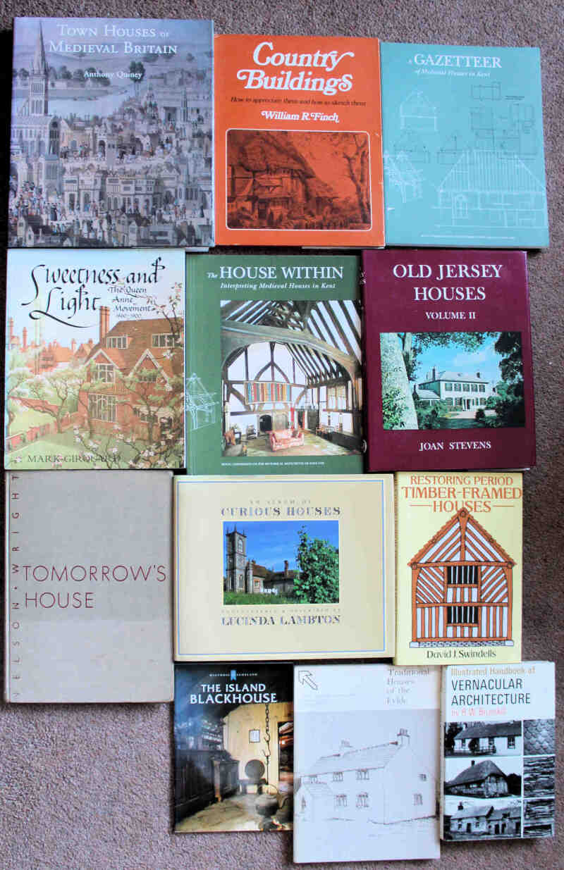 Quiney Town Houses of Medieval Britain 2004 in d/jkt; Barnwell & Adams The House Within: Interpreting Medieval Houses in Kent 1995; Girouard Sweetness and Light: The Queen Anne Movement 1860-1900, 1984; Swindells Restoring Period Timber-Framed Houses 1987, in d/jkt; Stevens Old Jersey Houses Vol.II, 1977, in d/jkt; and others on domestic and vernacular architecture. Good to fine. (11)