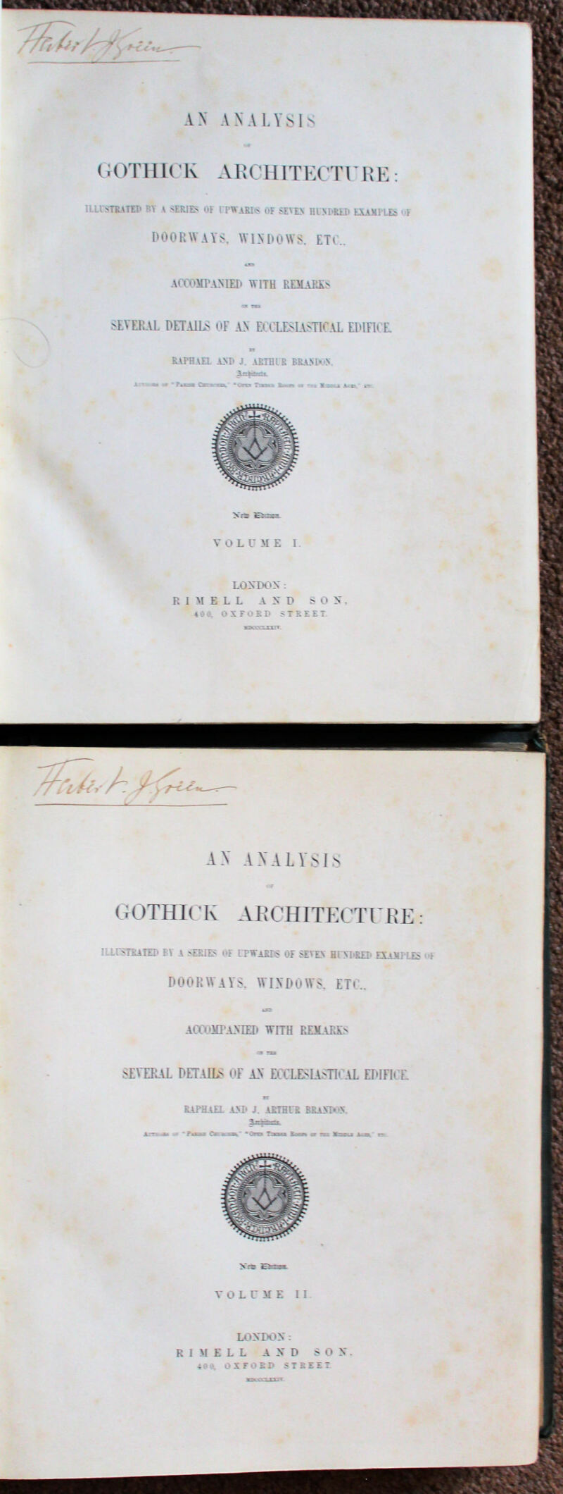Raphael & J. Arthur Brandon An Analysis of Gothick Architecture 1874, New Edition, 2 vols, quarto, gilt cloth, 158 plates, some repair to hinges, around 30 plates affected by foxing o/w clean internally.