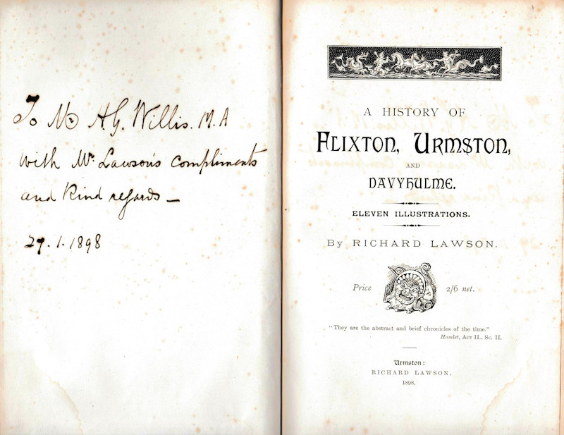 Richard Lawson A History of Flixton, Urmston and Davyhulme, Richard Lawson, 1898, original printed boards very worn, good internally, signed & inscribed by the author to H.G. Mills. 152pp + 10 plates