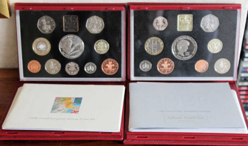 Royal Mint De Luxe Proof Sets for 1996, 1997, 1998, and 1999, all with COA in the issued leather-covered cases. VF
