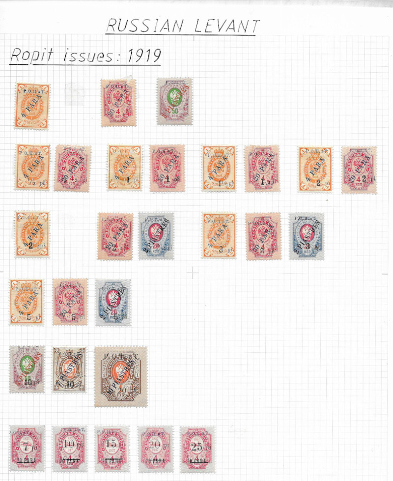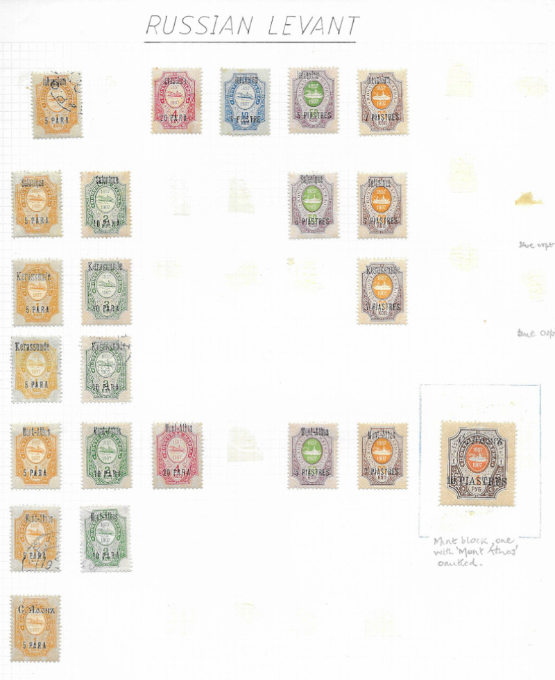 Russia 1900s/1920s M&U ranges on leaves with main interest in Russian Levant and various Revolutionary period issues. Mint predominate. Also some later issues. (Few 100s)